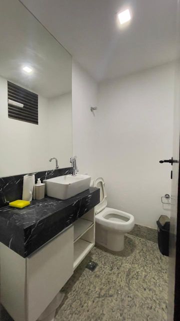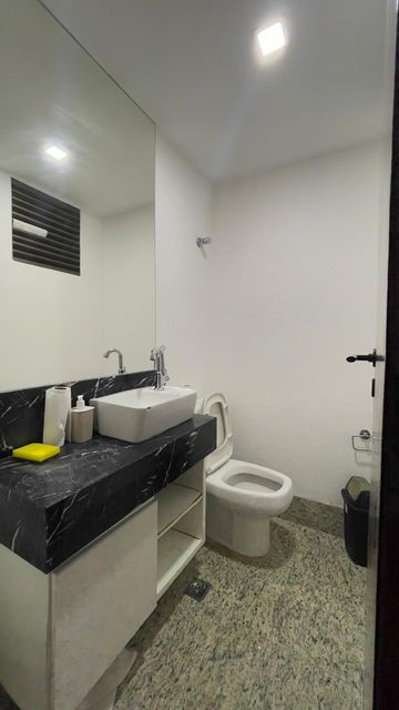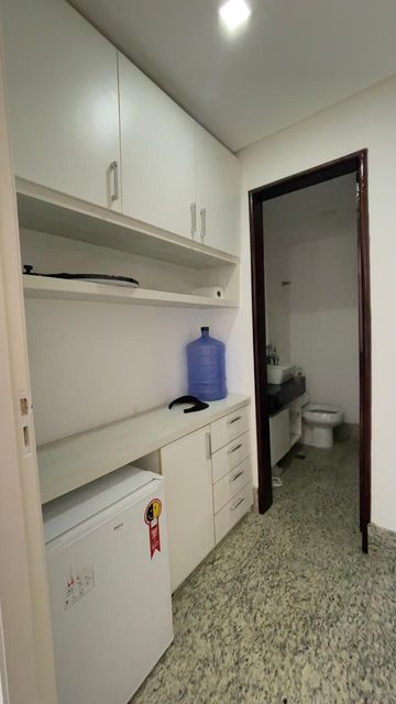 » Banheiro privativo, prédio com elevador, recepção e galeria de lojas.